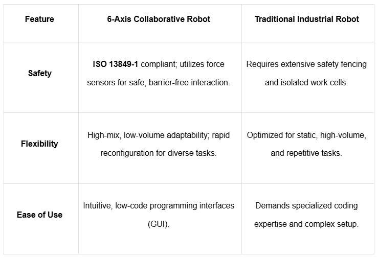 A diferencia de la automatización tradicional diseñada para el aislamiento, el Robot colaborativo de 6 ejes está diseñado para la interacción. Aunque iguala la capacidad mecánica (o la precisión) de los sistemas heredados, su valor diferencial reside en su filosofía de diseño “sin barreras”, que le permite operar con seguridad junto a los humanos sin barreras físicas.